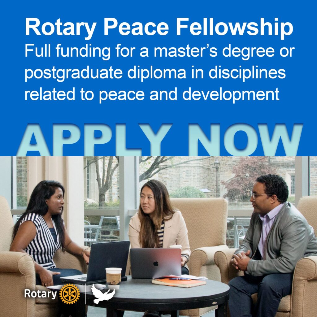 The Rotary Foundation is now accepting applications for 2025 Rotary Peace Fellowships! Each year, Rotary awards fully funded fellowships for peacebuilders from communities around the world to study at one of our global peace centers located at premier universities — including our newest peace center in Istanbul. Fellows earn a master’s degree or a postgraduate diploma in disciplines related to peace and development. The deadline to apply is 15 May 2024. Learn more at rotary.org/peace-fellowships.